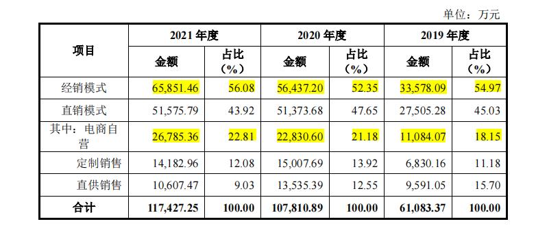 白家阿宽最新披露的招股书显示,从2019年到2021年,其电商自营的营收占比分别为18.15%、21.18%、22.81%,并且比例呈逐年上升趋势。
