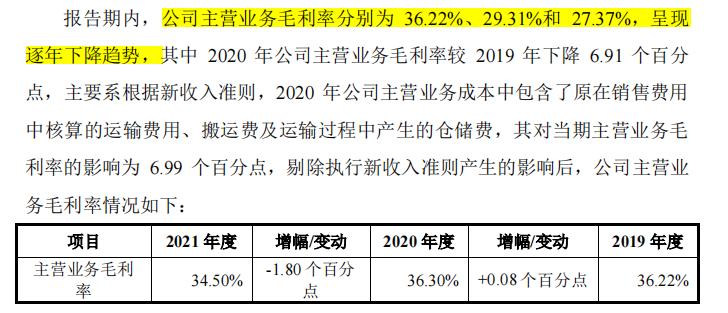 其招股书显示,在剔除执行新收入准则产生的影响后,2019年至2021年公司主营业务毛利率分别为36.22%、36.30%和34.50%,呈现逐年下降趋势。其中,2021年主营业务毛利率较上一年下降1.94个百分点,2020年公司主营业务毛利率前上一年下降6.91个百分点。