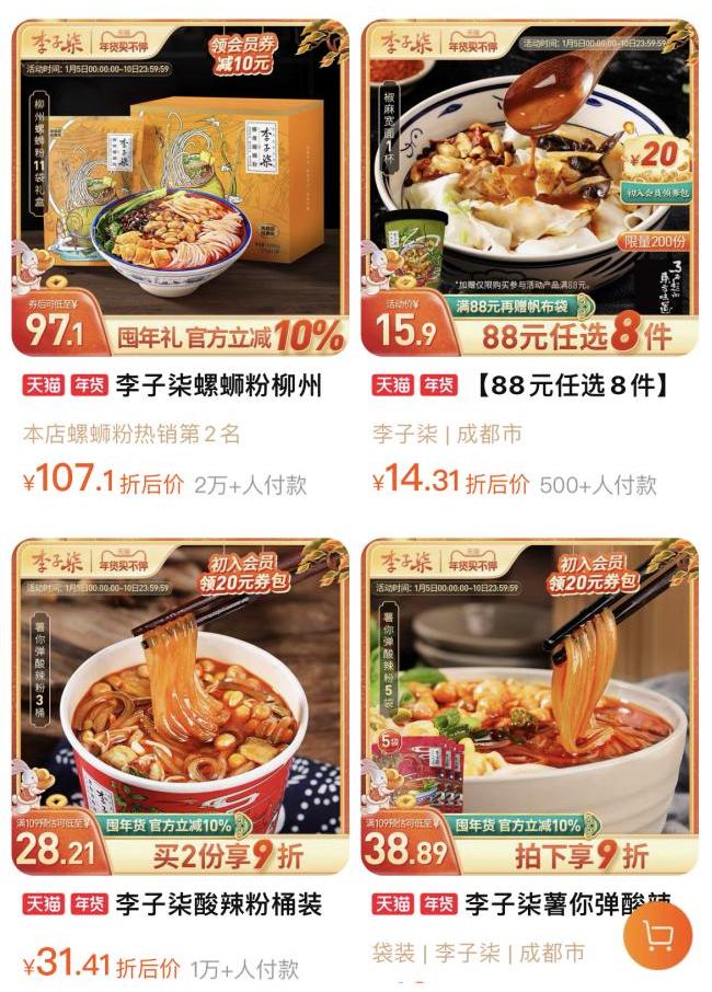 这一波操作下来,可想而知,李子柒家相关的产品也要迎来一波新的营销热潮。而且除了螺蛳粉外,李子柒家也涉及酸辣粉、红油宽面等产品,并且销量也不低。