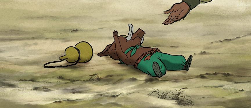 《鹅鹅鹅》时刻变换的大小关系也很有意思,一边是狐狸公子藏身鹅笼,心上人置于心腹,另一边是货郎醉酒后头变得比山还大,狐狸公子龇牙咧嘴占据整个屏幕,似乎货郎进入的鹅山不大,背着的鹅笼不小。