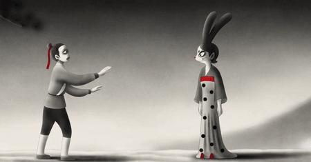动画里还有一个有趣的设置,《鹅鹅鹅》本身是默片,用了第二人称的字幕推进情节,让观众代入货郎的视角,似乎我们就是故事里的主人公,强化了全程的情感体验。