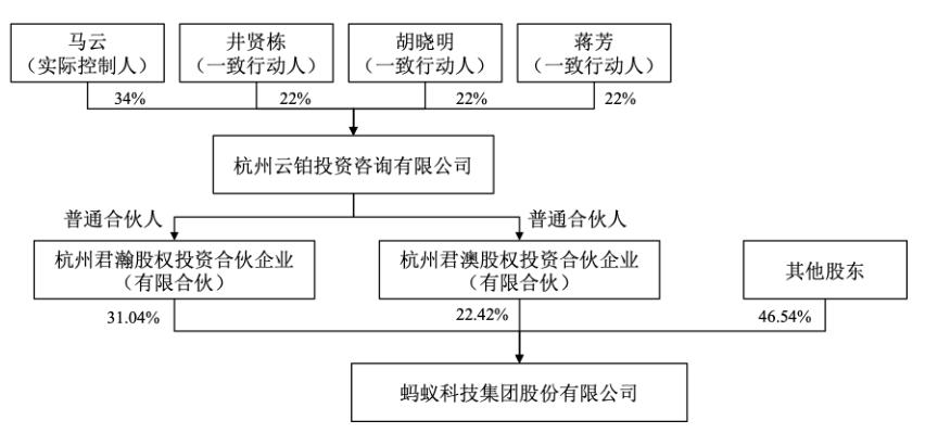 事实上,自2011年蚂蚁集团从阿里巴巴分拆后,马云一直是蚂蚁集团的实际控制人。从最近的持股比例来看,马云与井贤栋、胡晓明、蒋芳四人以一致行动人的方式分别持有云铂投资34%、22%、22%及22%的股权。