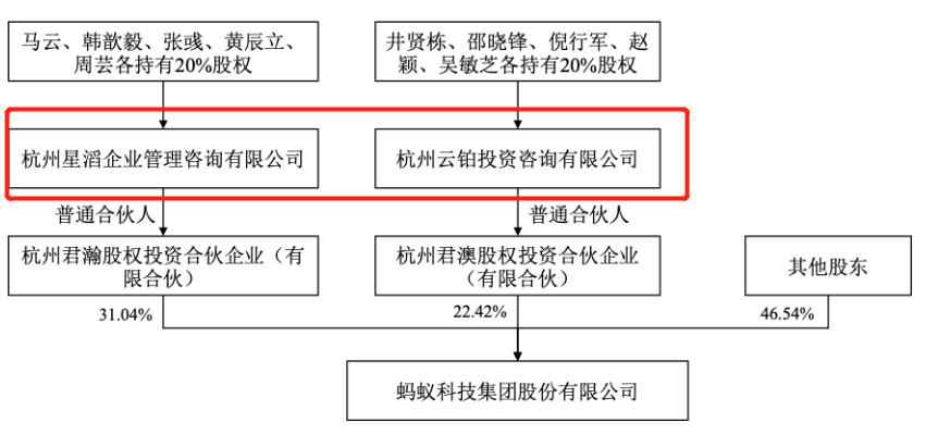 而本次调整,则拆除了原控制结构。云铂投资从杭州君瀚退伙,重新引入了杭州星滔企业管理咨询有限公司(以下简称“杭州星滔”)担任杭州君瀚的普通合伙人暨执行事务合伙人。并由马云、韩歆毅、张彧、黄辰立、周芸分别持有杭州星滔20%的股权。