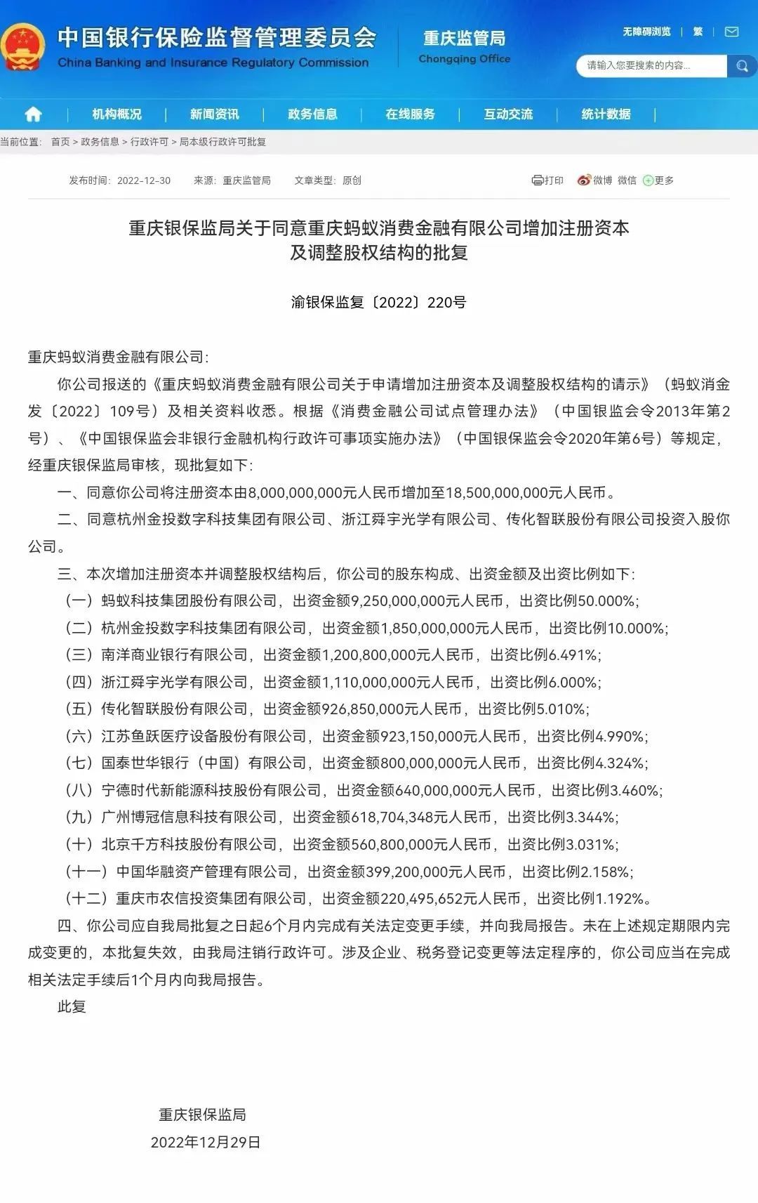 (重庆银保监局同意重庆蚂蚁消费金融增资,来源:银保监会官网)