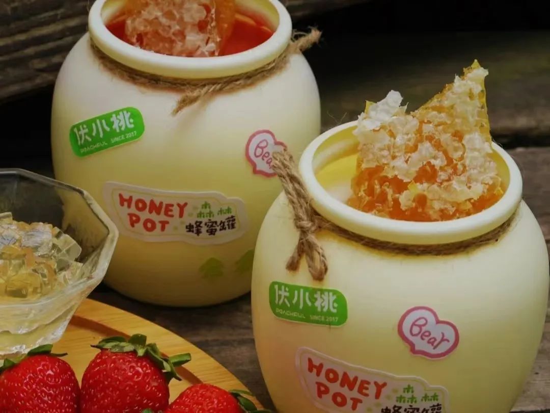 此外,还可以考虑提升饮品的感官刺激度,通过把珍珠做大、小料顶端展示等方式。 去年SEVENBUS推出的“巨型珍珠奶茶”和伏小桃的蜂蜜罐都是这个思路。