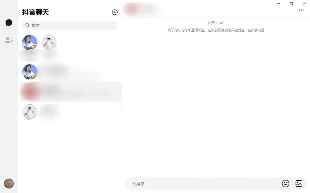 界面布局上,「抖音聊天」与电脑版微信十分相似,左侧是聊天和好友栏,中间是好友列表,右侧是对话框。不同之处在于,「抖音聊天」目前的只有「聊天」和「添加好友」两个功能,没有其他的功能选项。