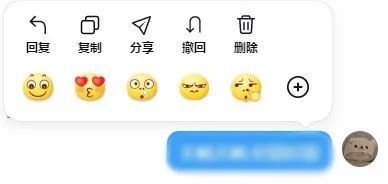 聊天界面支持发送表情与图片,好友间发送的消息支持回复、复制、分享、撤回与删除,也可以设置好友置顶、信息免打扰、拉黑、举报等功能。