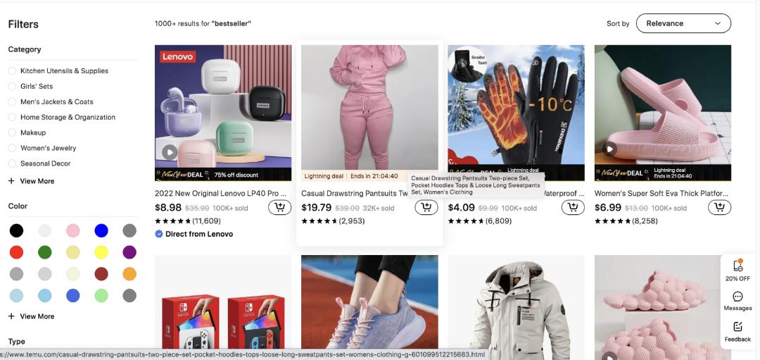 Temu平台上给美国消费者提供14个类别的产品,包括服装、配饰、宠物用品和美容产品,根据 Temu 的网站,其在美国的业务由总部位于特拉华州的 Whaleco Inc.运营。整个平台的商品价格跟国内一样,主打极致性价比。