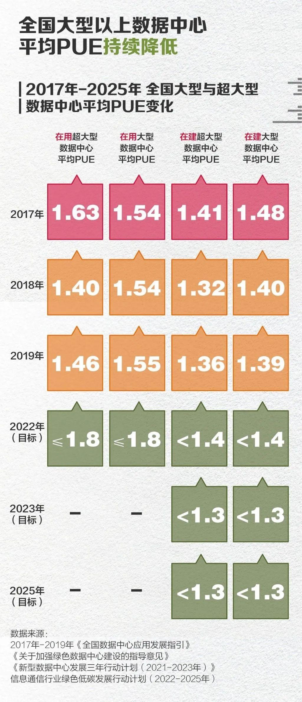随后在12月,《贯彻落实碳达峰碳中和目标要求 推动数据中心和5G等新型基础设施绿色高质量发展实施方案》又进一步明确,到2025年,国家枢纽节点的PUE要进一步降到1.25以下,绿色低碳等级达到4A级以上。