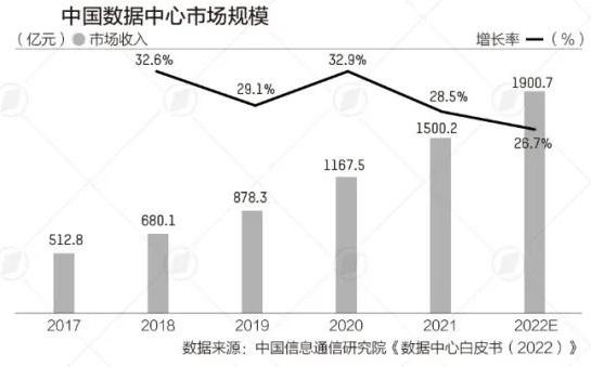 建设速度加快,数据中心的业务收入也随之高速增长。据《数据中心白皮书(2022)》统计,2021年我国数据中心行业市场收入达到1500亿元左右,近三年年均复合增长率达到30.69%,预计2022年将超过1900亿元。