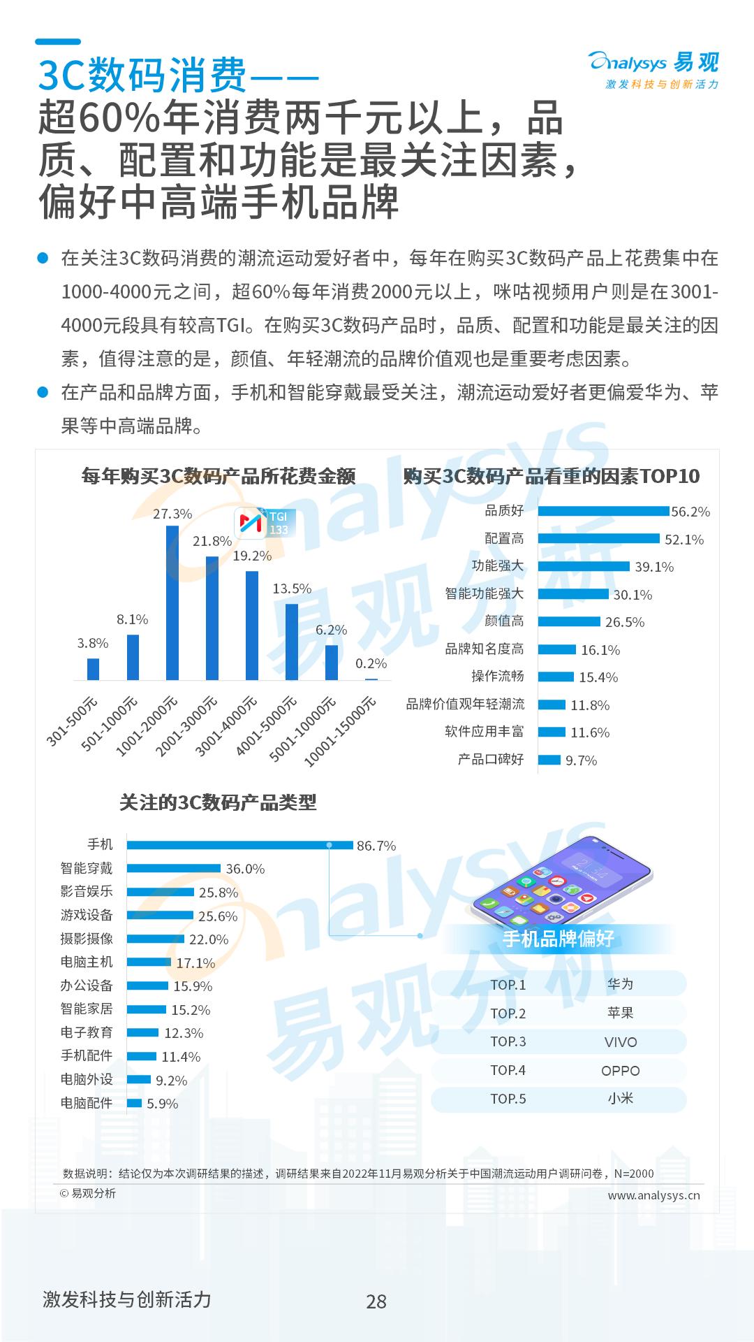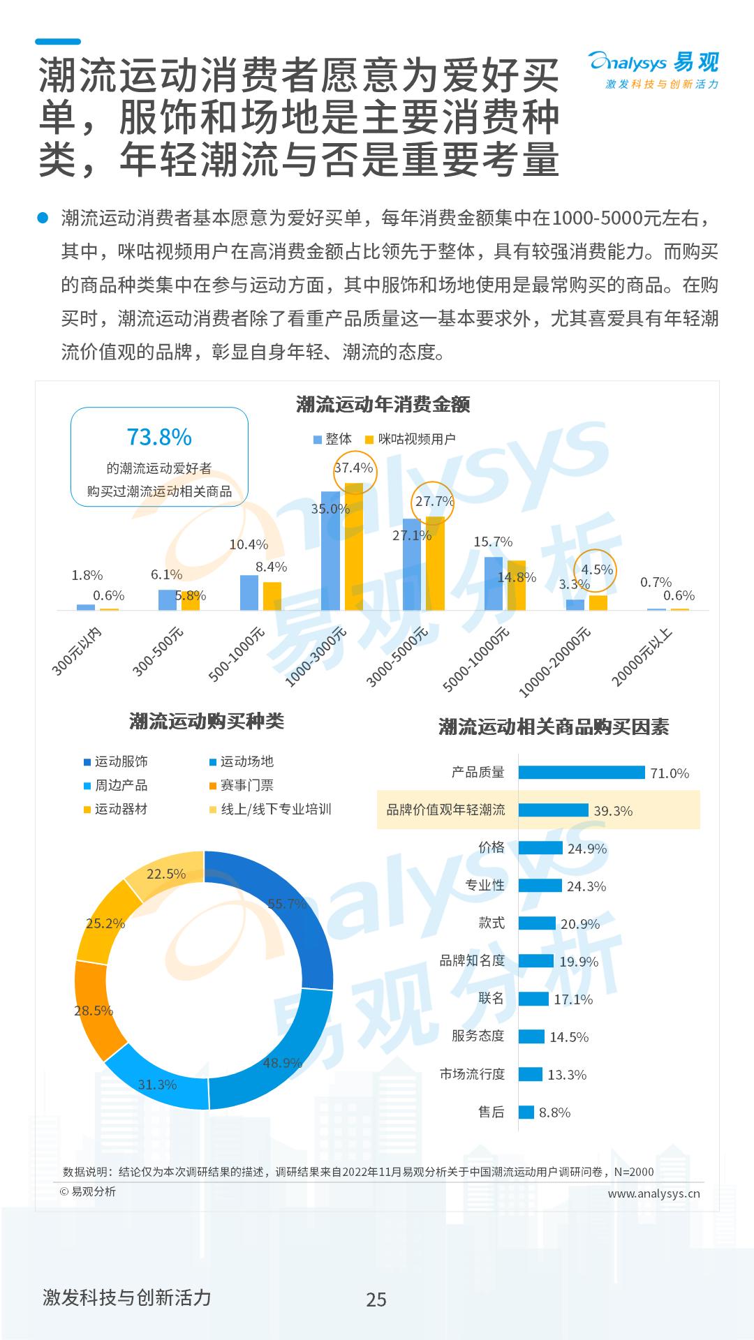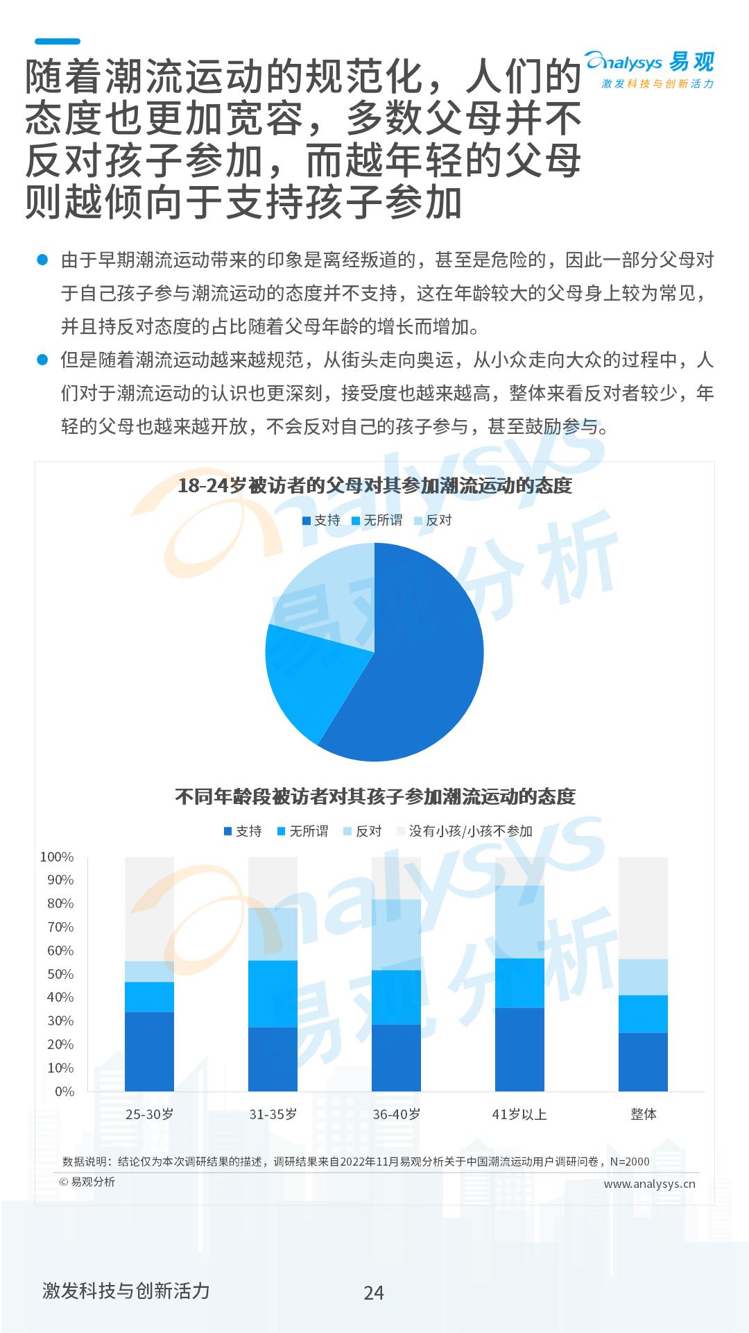 从潮流运动爱好者特点来看,年轻群体具有高关注、深参与的特点,定期、主动关注成为潮流运动爱好者的日常,趣味性、挑战性和潮流性是选择参与潮流运动的重要原因。随着潮流运动的规范化,人们的态度也更加宽容,多数父母并不反对孩子参加,而越年轻的父母则越倾向于支持孩子参加。潮流运动消费者则愿意为爱好买单,服饰和场地是主要消费种类,年轻潮流与否是其重要考量。