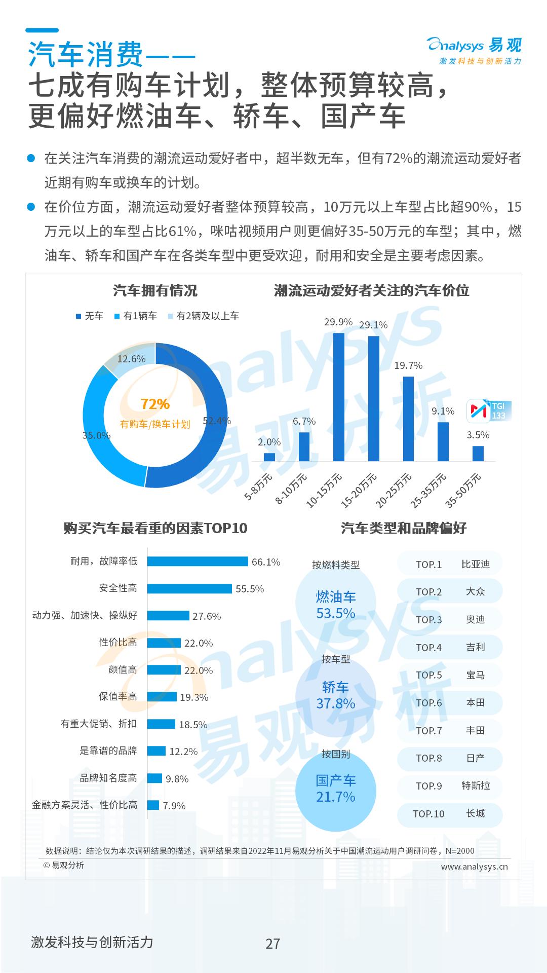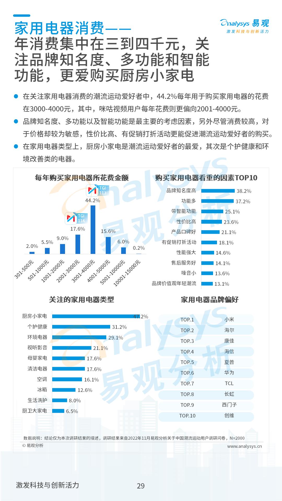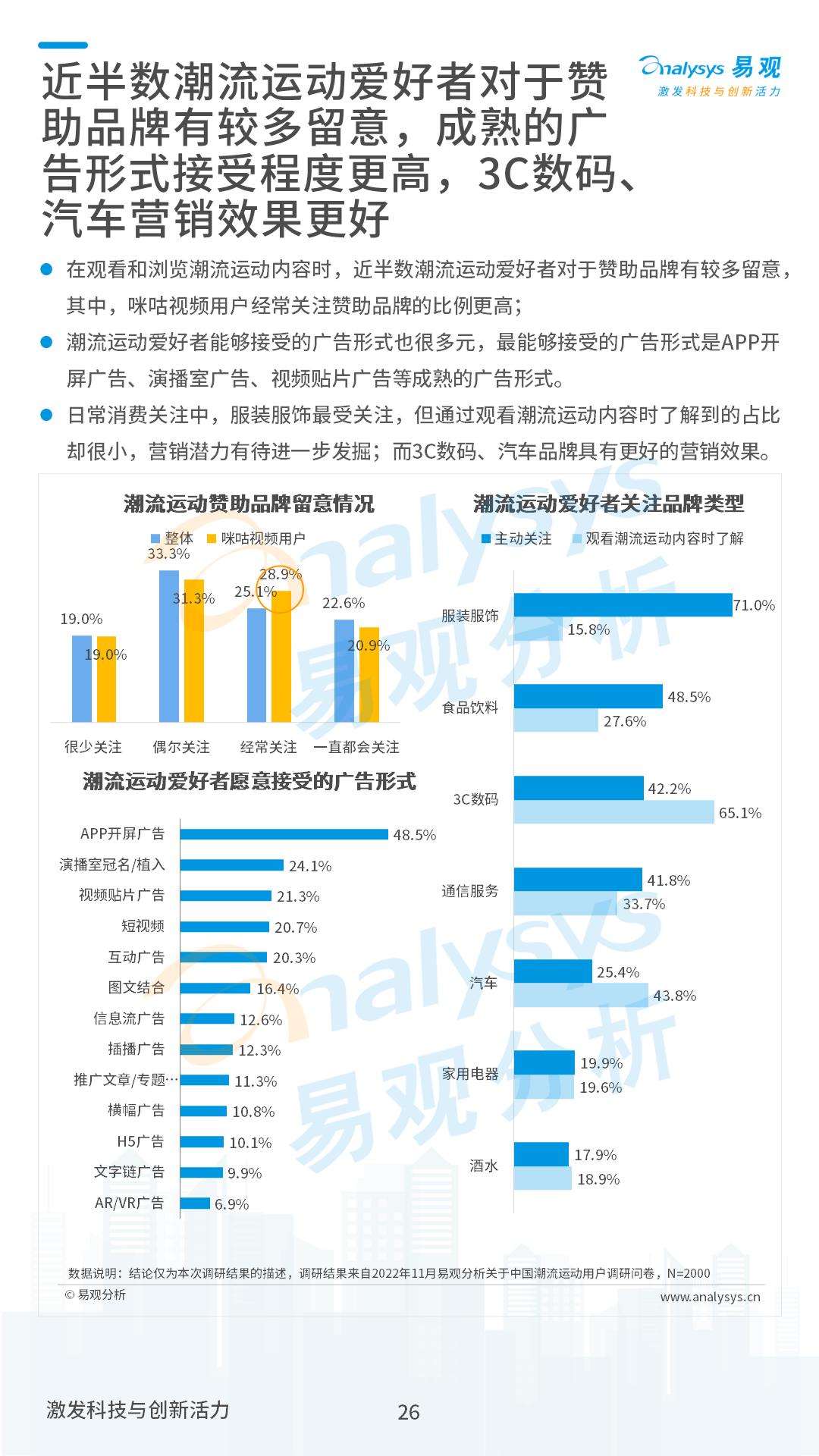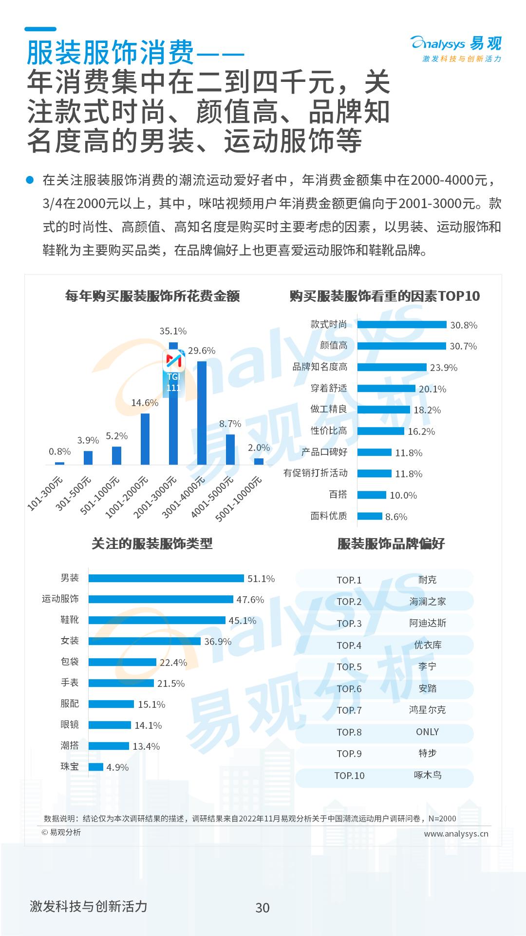 从潮流运动爱好者特点来看,年轻群体具有高关注、深参与的特点,定期、主动关注成为潮流运动爱好者的日常,趣味性、挑战性和潮流性是选择参与潮流运动的重要原因。随着潮流运动的规范化,人们的态度也更加宽容,多数父母并不反对孩子参加,而越年轻的父母则越倾向于支持孩子参加。潮流运动消费者则愿意为爱好买单,服饰和场地是主要消费种类,年轻潮流与否是其重要考量。