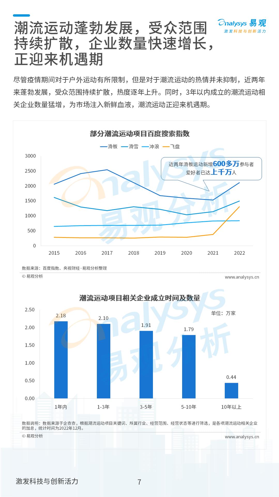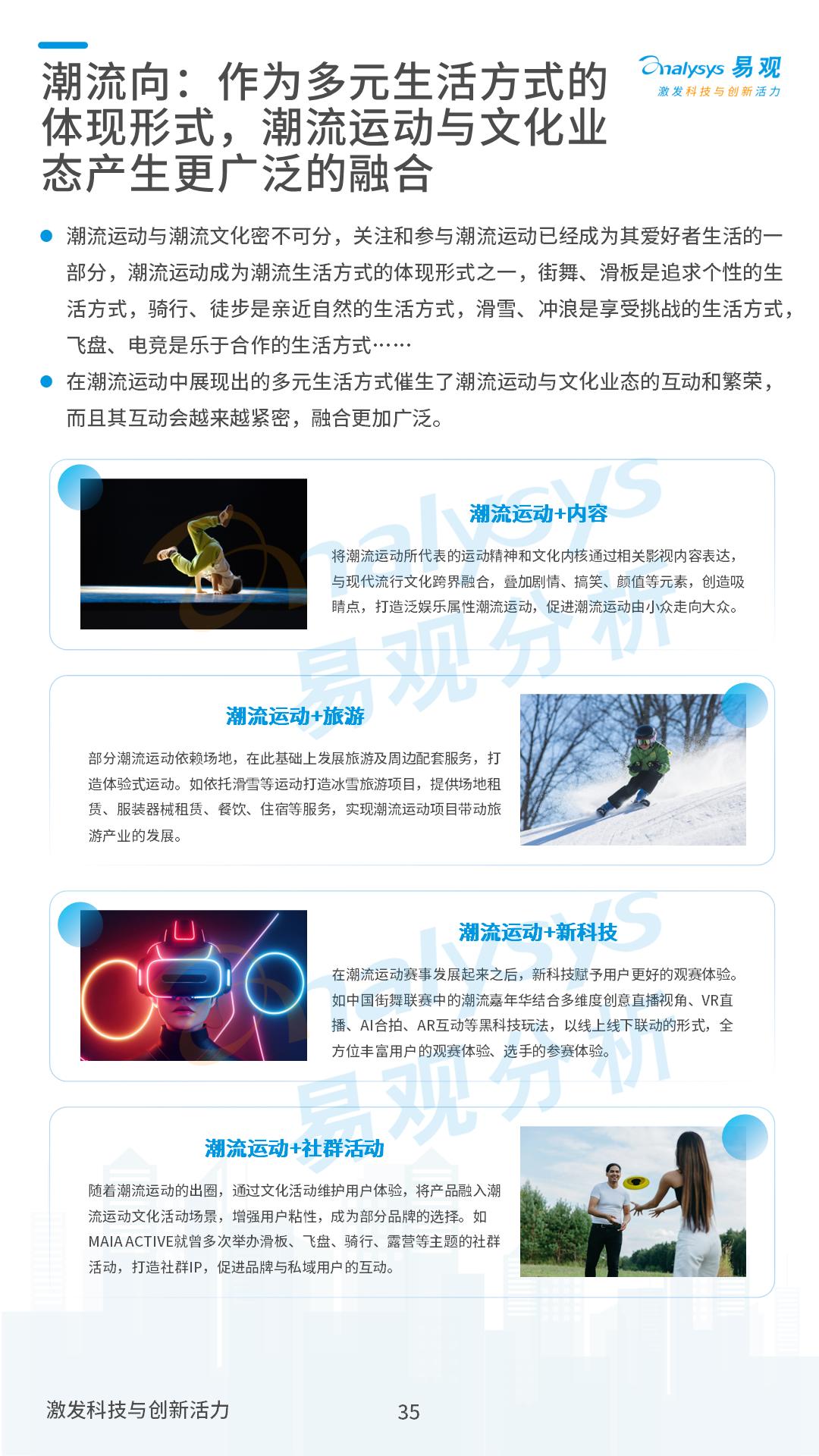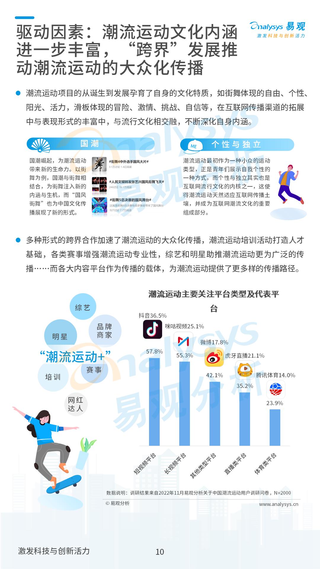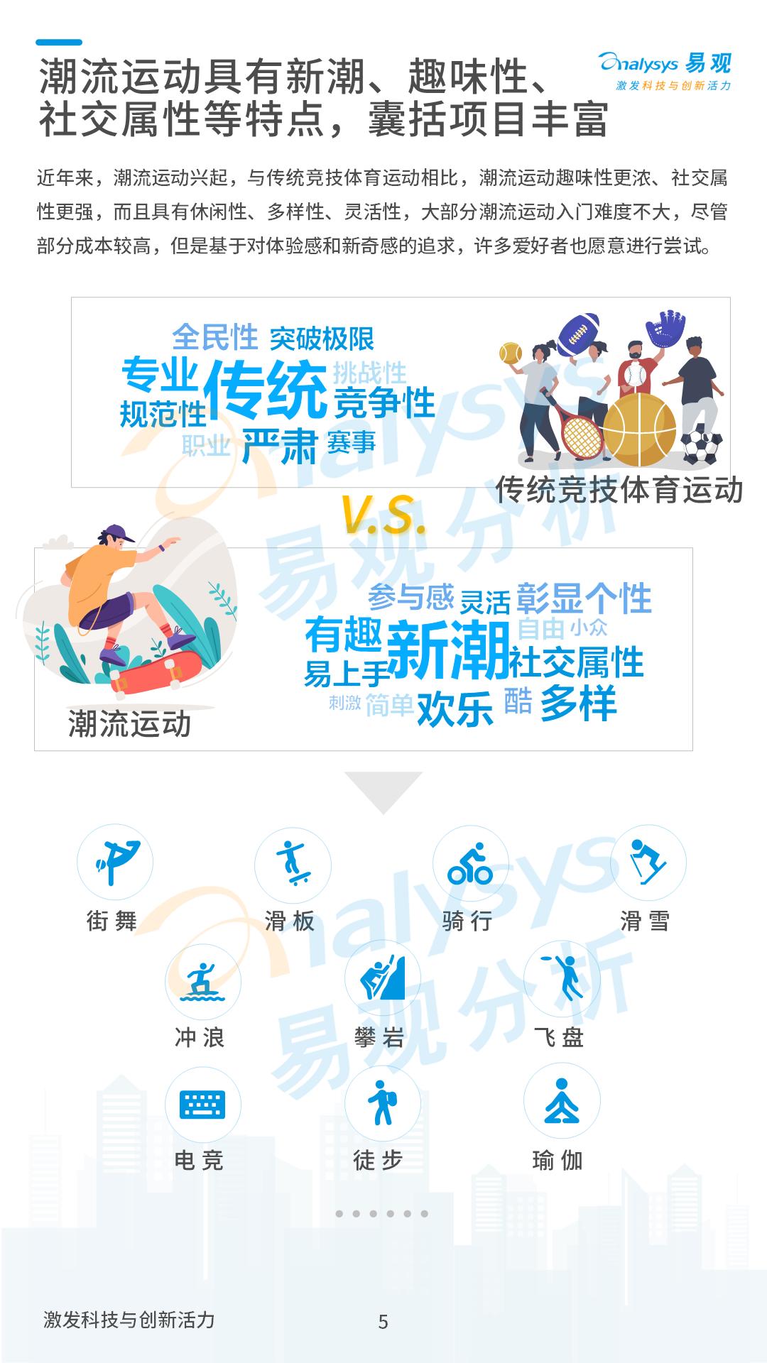 易观分析:近年来,潮流运动兴起,与传统竞技体育运动相比,潮流运动趣味性更浓、社交属性更强,而且具有休闲性、多样性、灵活性,在政策的引导、群众认知升级以及流行文化的驱动下蓬勃发展,目前已经具有广告营销、教育培训、体育赛事、运动用品等商业实践,正迎来发展机遇期。