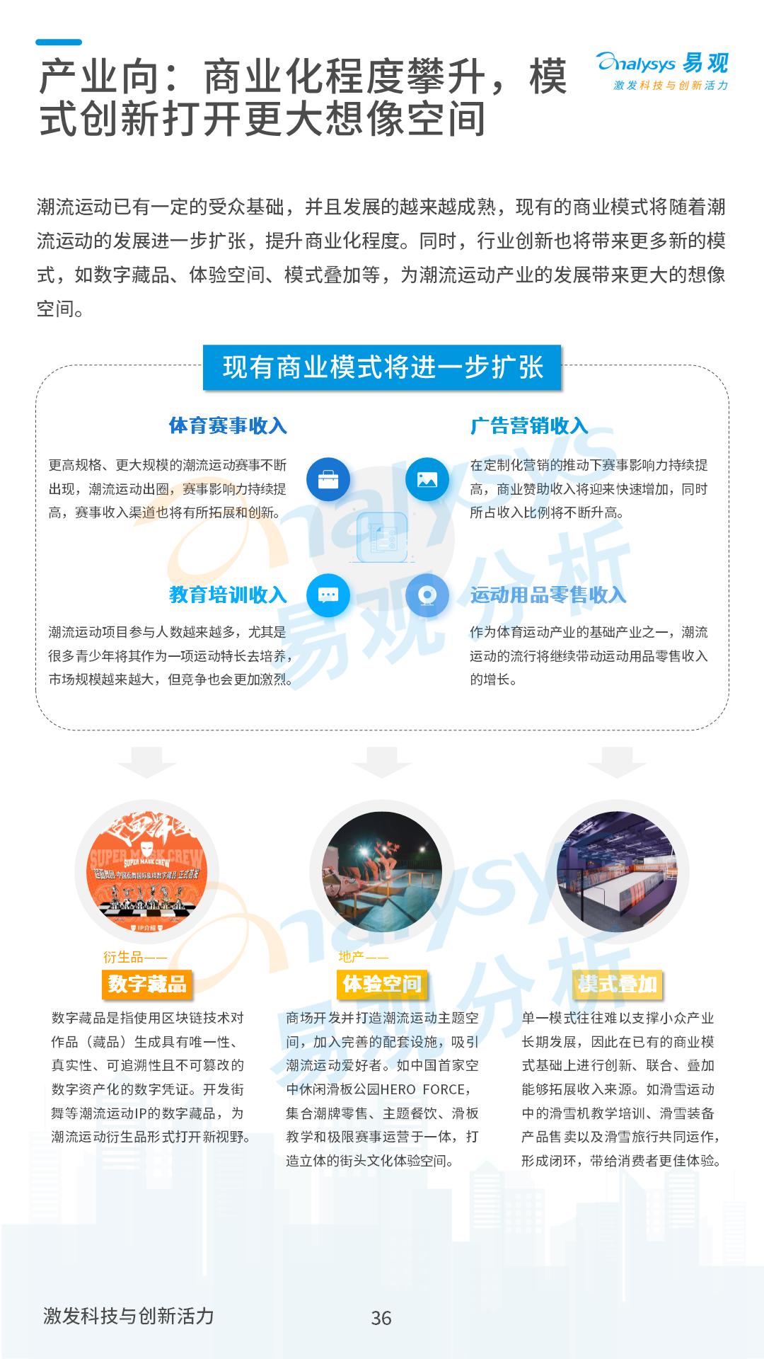 未来,潮流运动将加速规范化布局,搭建专业化发展体系,与文化业态产生更广泛的融合,提升商业化程度,创新模式,打开更大想像空间。