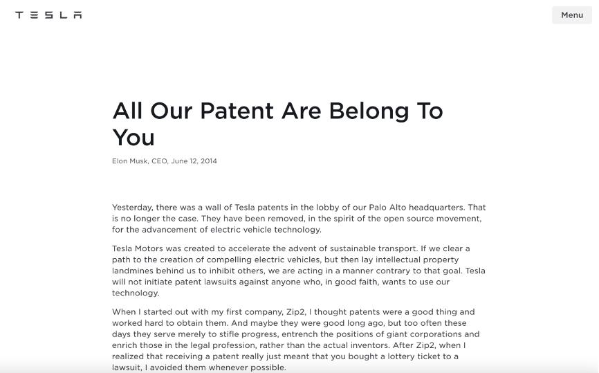 之后一周内,特斯拉股价飙升40%,市值一度高达100亿美元,甚至超过了老牌汽车公司菲亚特和三菱。把时钟往后拨到2014年,那一年,马斯克在特斯拉官网发布了那篇著名的《All Our Patent Are Belong To You》,他说“昨天,在我们总部的大堂里有一面专利墙,但如今情况变了,为了推进电动车技术的发展,我们推倒了这堵墙。”