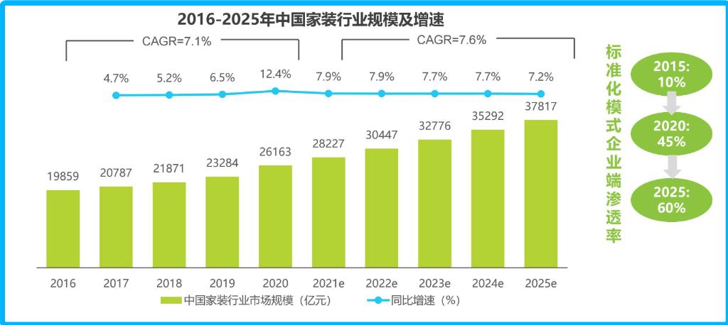 而艾瑞咨询发布的《中国家装行业研究报告》显示,中国集装行业基数大,市场空间广阔增速平稳,行业标准化趋势明显,伴随老房改造需求的不断释放和精装修政策的激励,2025年家装行业市场规模预计将达到3.78万亿,年复合增长率达7.6%。