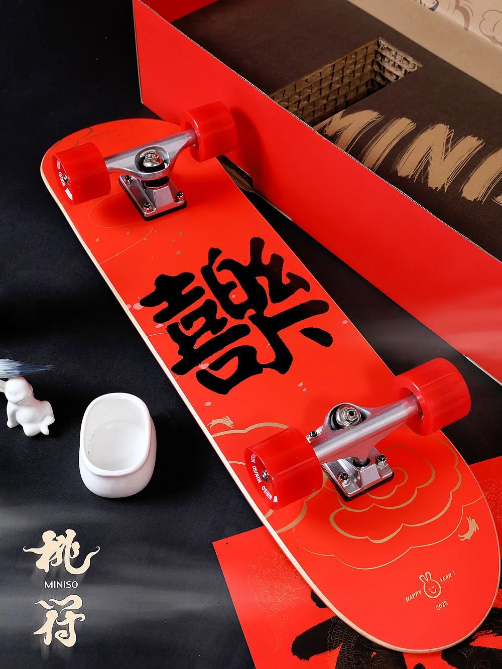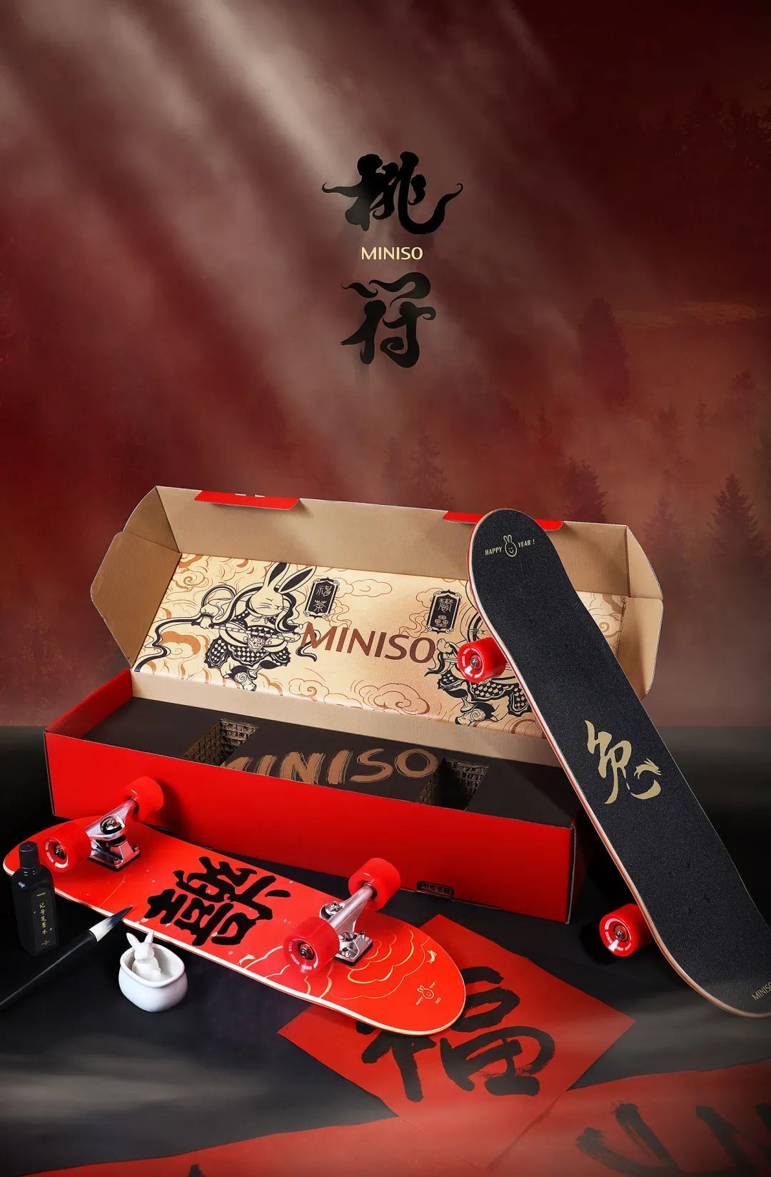 名创优品给这个礼盒取了一个又潮又中国风的名字——“桃符”。作为古代的春联,承载着人们对新春的祝福和对美好生活的追求,新意满满的新年“桃符”礼盒不仅用滑板串联起中国传统文化与现代时尚潮流,更与“好看、好玩、好用”的品牌理念一脉相承。