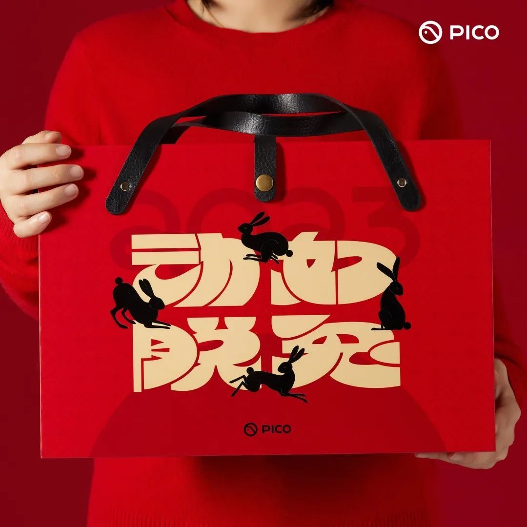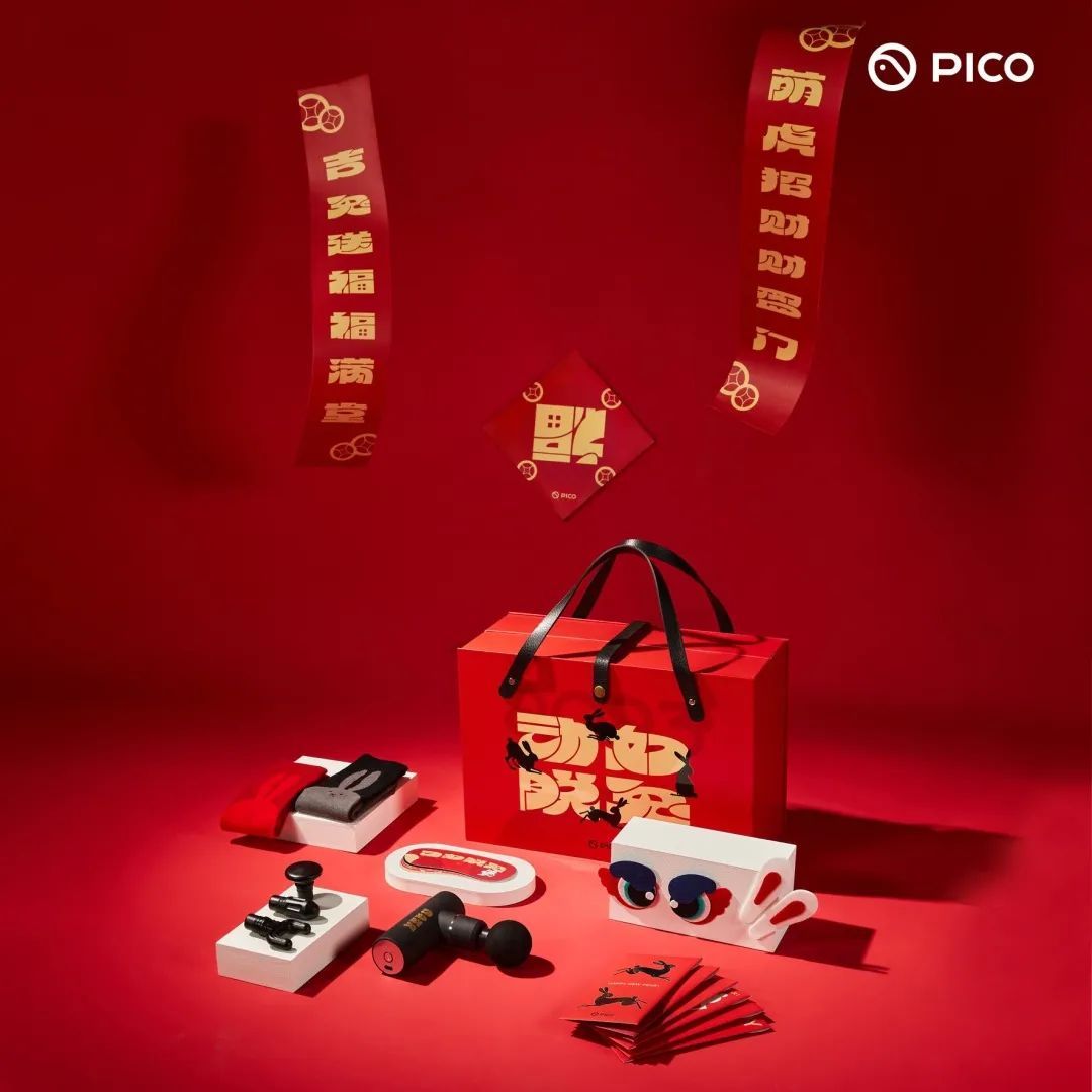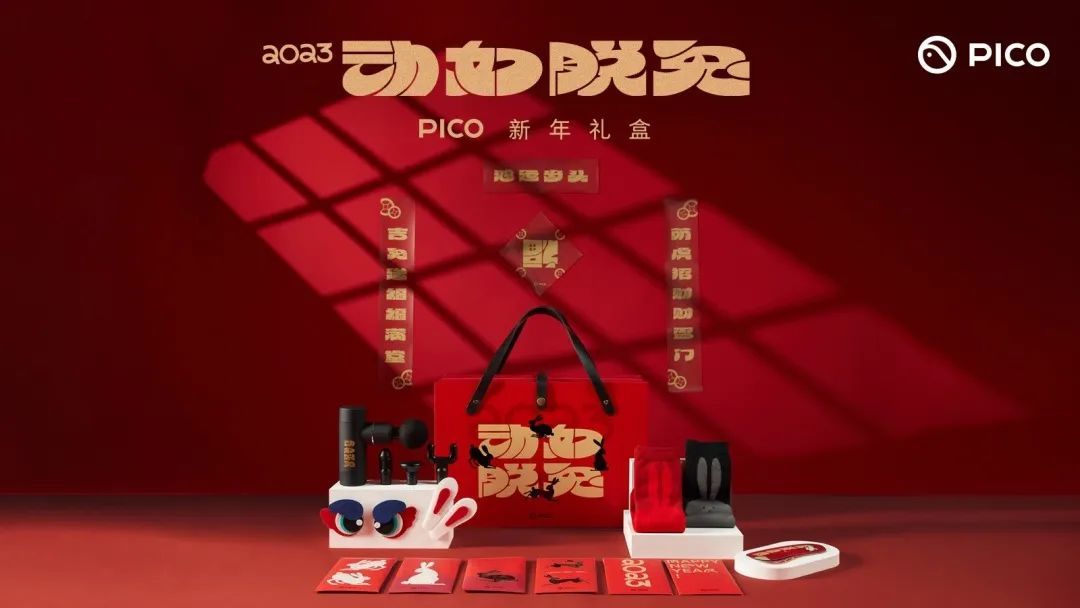 PICO 2023新年礼盒以「动如脱兔」为主题,在极富新年氛围的美学设计之上,融入了兔年的生肖元素。礼盒内包含筋膜枪、小兔子防滑袜、春联福字红包组合、鸿运当头PICO眼镜贴及DIY毛毡套装,精致且实用,并呼应了产品VR运动健身「活力集结、趣味开练」的场景优势。