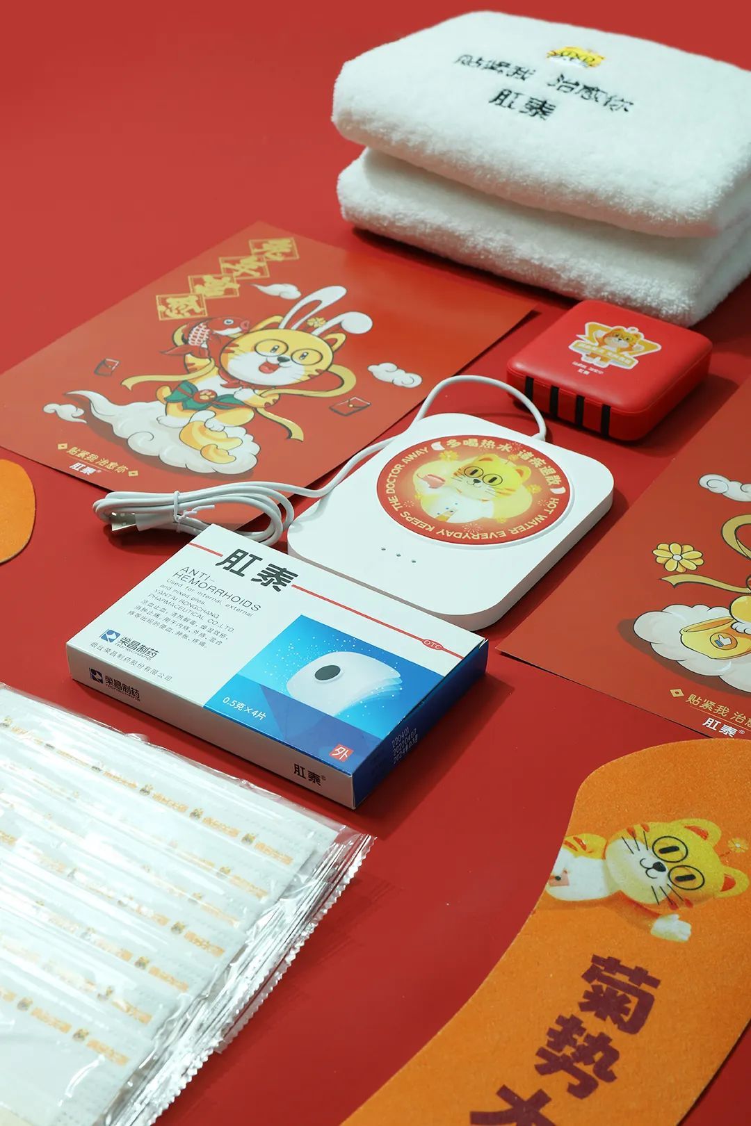 此外,「菊部稳腚」马桶贴,愿你享受每一次落座;「肛泰COOL DOWN」湿厕纸,愿你在新的一年里始终清爽透亮;「盼你痔愈」肛泰痔疮贴,继续做一个派不上用场的狠角色。