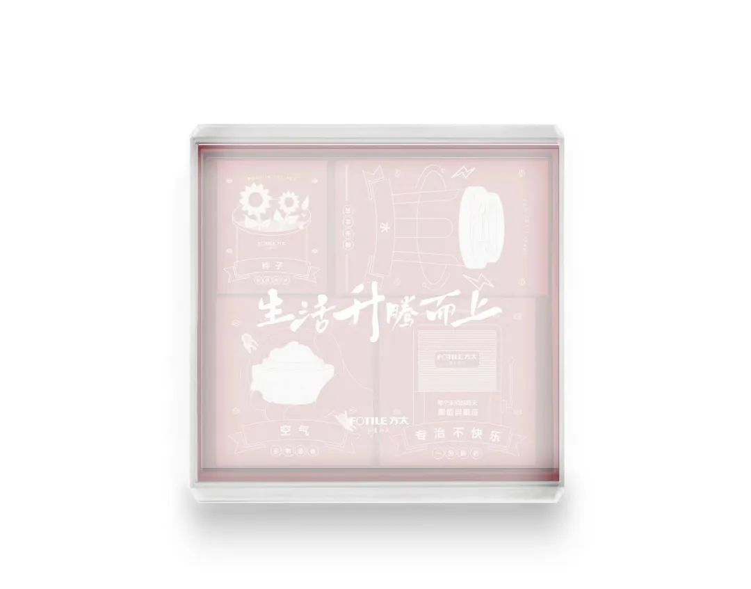方太的春节礼盒采用亚克力材质外盒,结合“生活升腾而上”的主题以及方太三大核心科技:“空气、食物和水元素”,内容物涉及种子、水杯、航天香薰、盲盒日历。