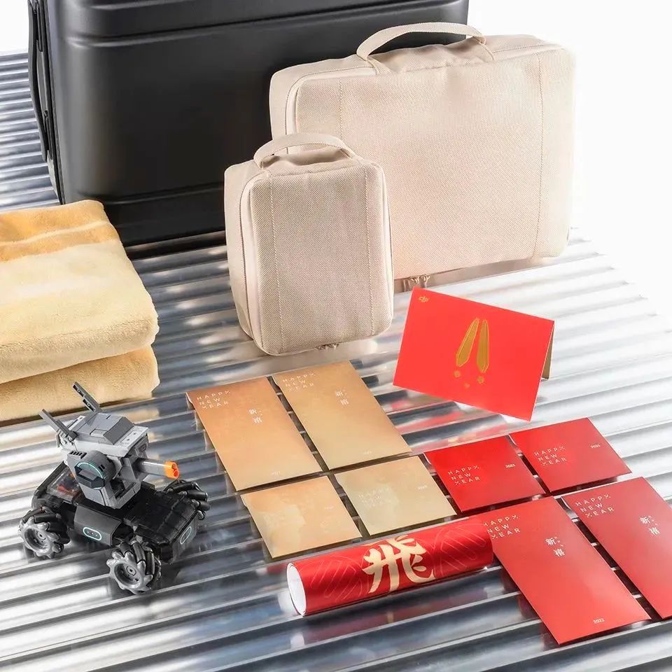 大疆春节礼盒以DJI HOME为主题,礼盒含有:20寸定制行李箱、定制收纳袋*3、定制午休毯、定制春节套装(春联+利是封+福字),最值得一提的是还有定制积木——RoboMaster S1。