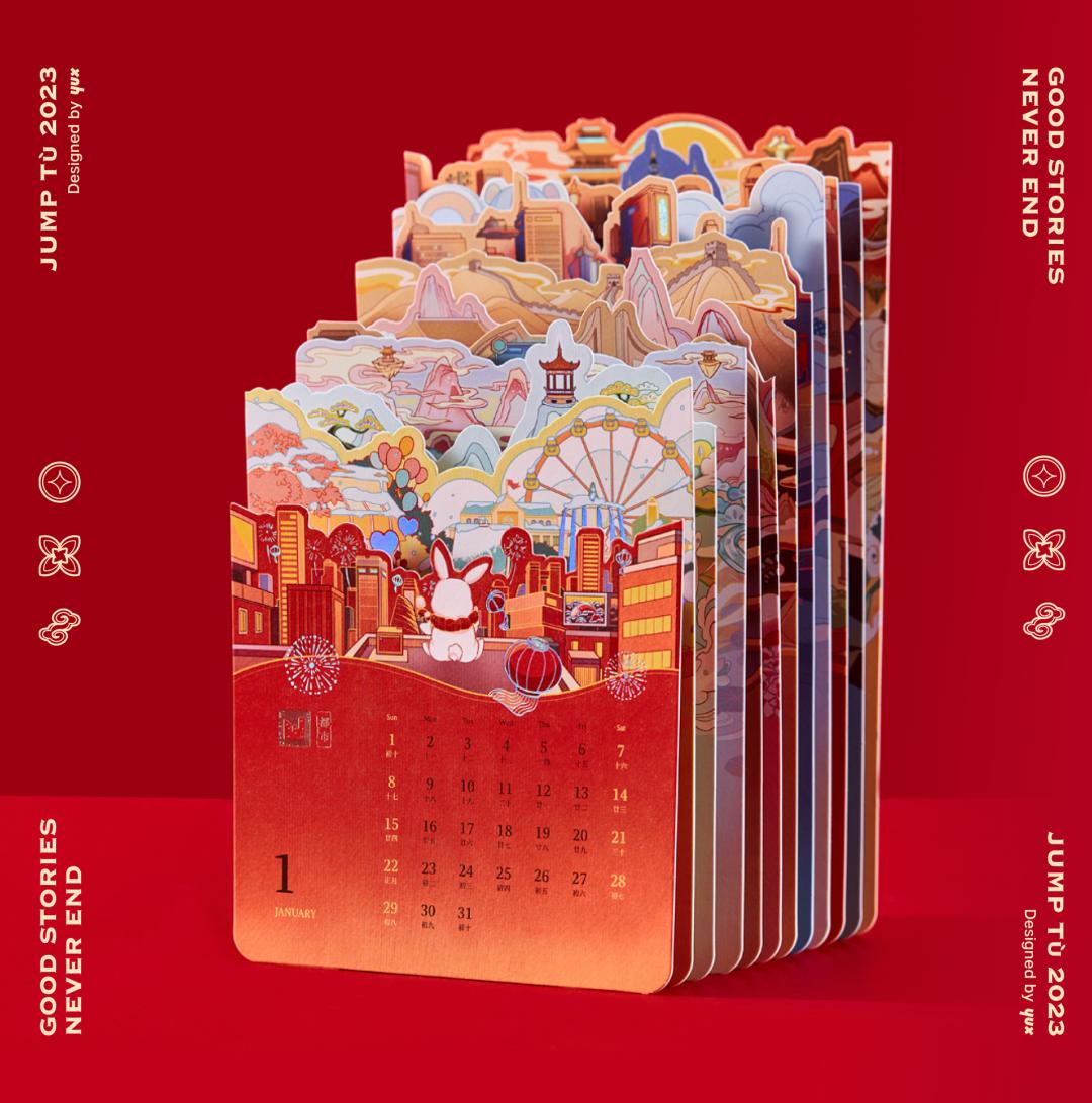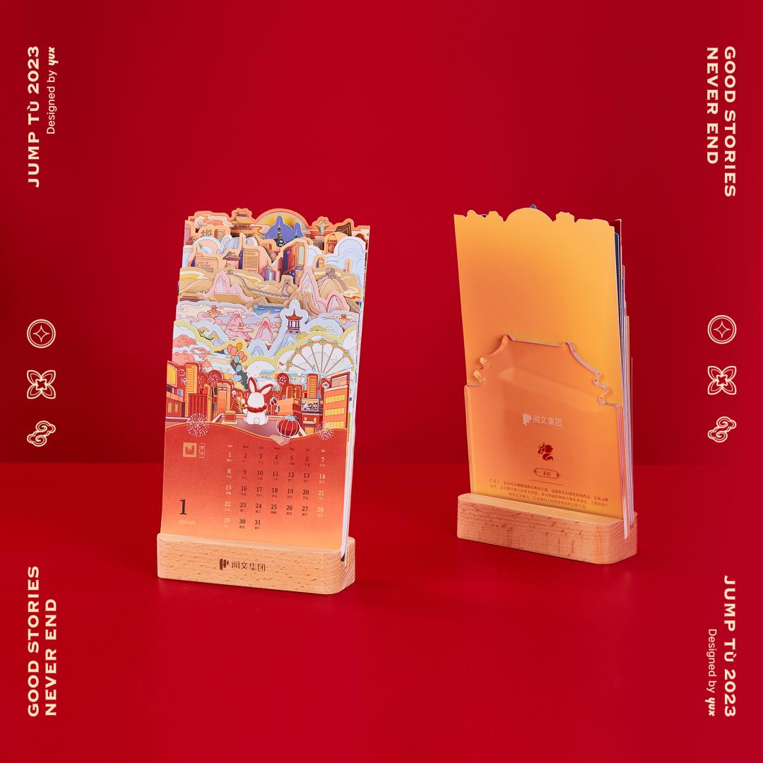 【福历】为此次礼盒最重要的礼品,画面与外盒的烫金图形成呼应,用组合-拆解-延伸的方式来让用户对网文分类有更直观的感受。