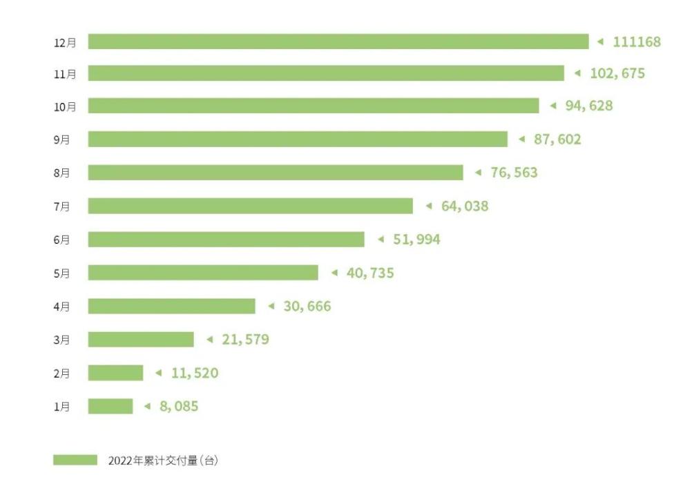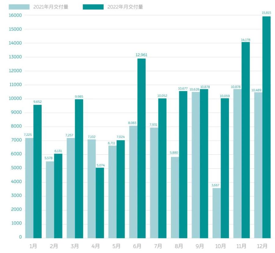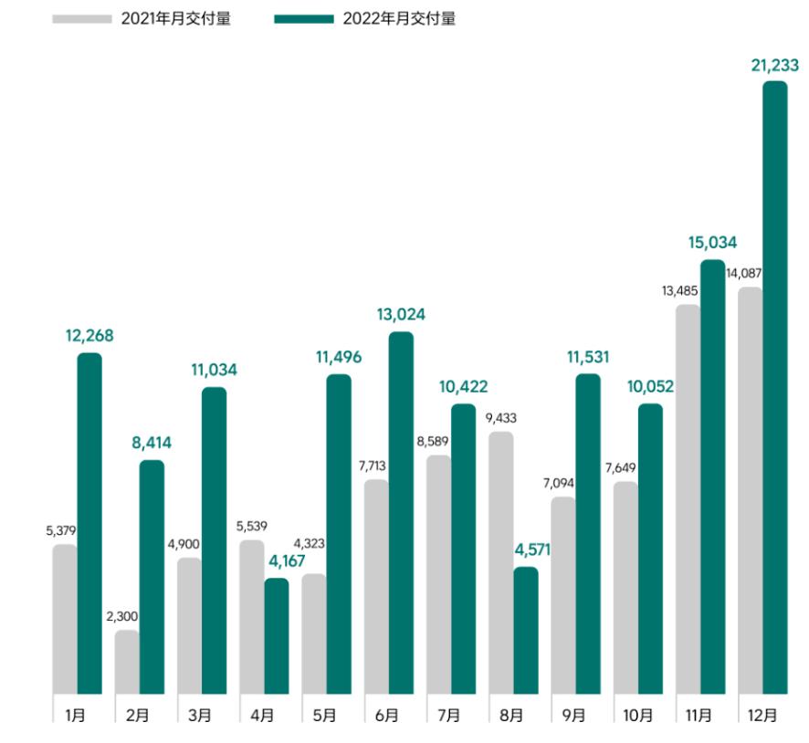 哪吒之后,理想汽车排在2022年交付量的第4位,全年累计交付13.3万辆新车,较上年同期增长47.2%。12月交付21233辆,环比上个月增长41%,创下理想的月交付新高。