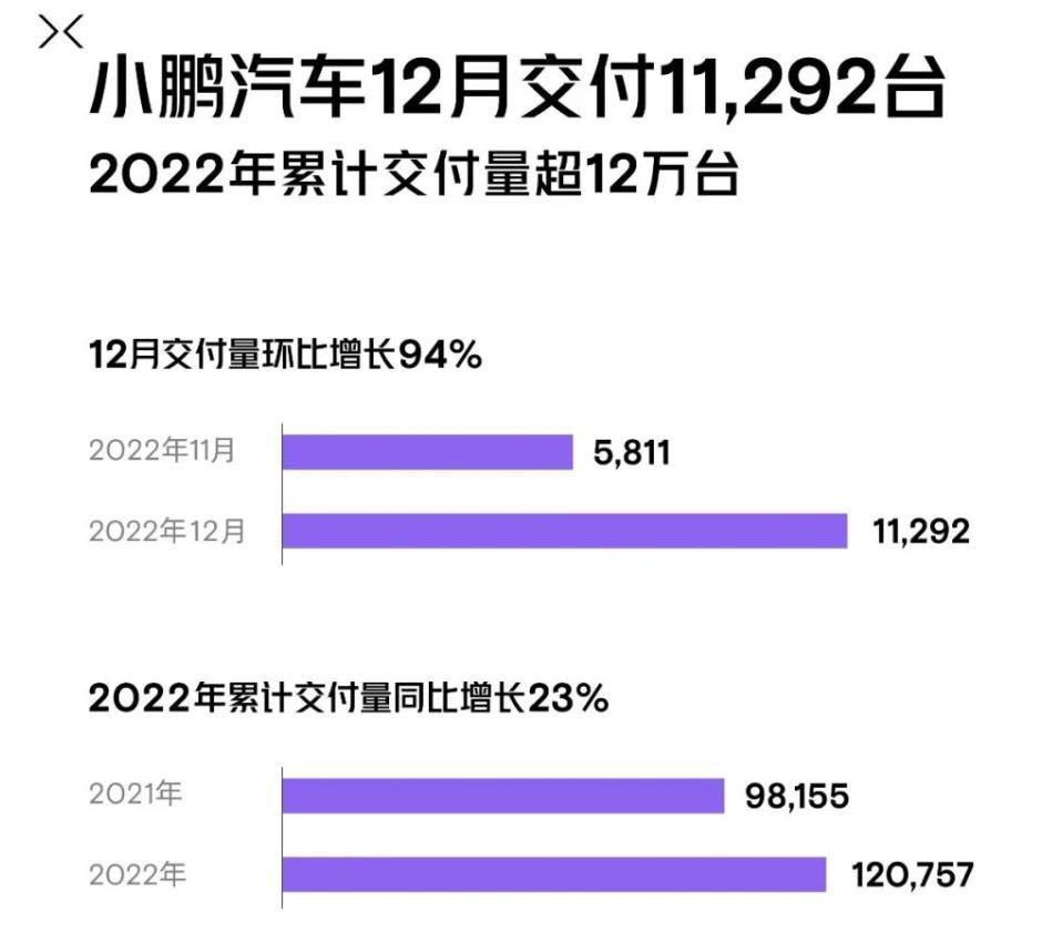 小鹏汽车在2022年累计销量为12.07万辆,较上一年增长23%。12月交付量11292辆,环比增加98%,终于在低迷了四个月之后,重新踏入月交付过万的门槛。