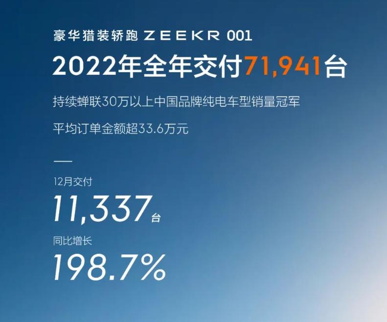2022年,极氪累计交付量达到7.2万台,排在国内新能源车企的第9位。12月交付11337辆,同比增长198.7%,环比增长3%,连续3个月突破万辆。