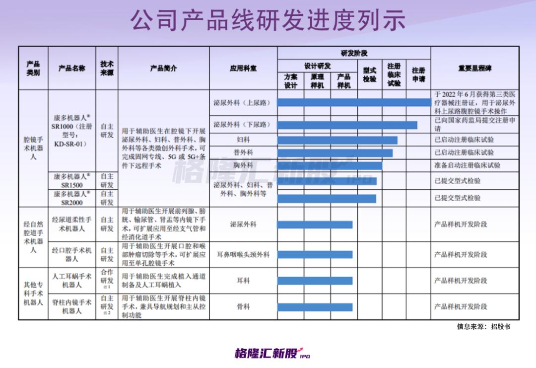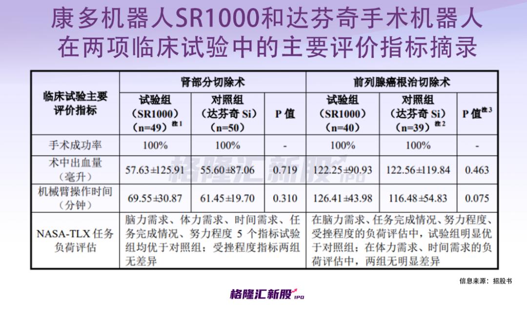 根据招股书,上述已完成的两项分别针对肾部分切除术和前列腺癌根治术的单一术式前瞻性、多中心、随机、平行对照设计的临床试验结果显示,康多机器人®SR1000与对照组达芬奇手术机器人在主要有效性终点手术成功率方面均达到100%。