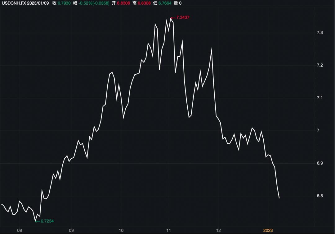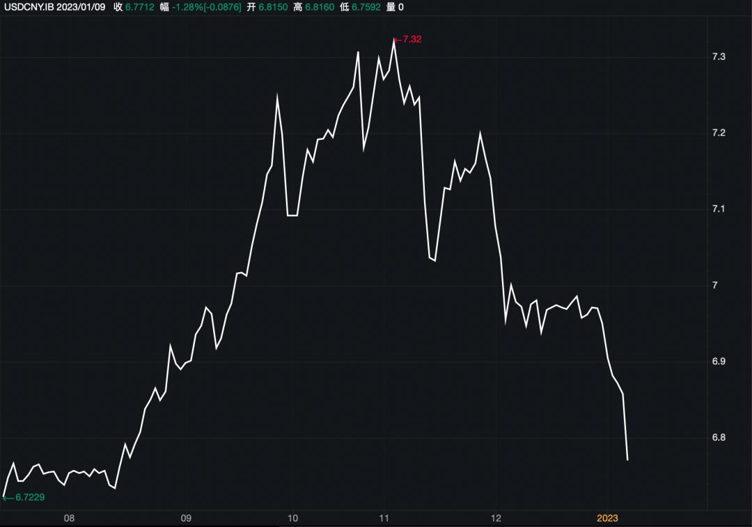 本轮人民币升值始于2022年11月份。在岸人民币对美元汇率由11月1日的低点7.328,一路走强至目前的6.7592,期间累计上涨超过5600个基点;离岸人民币对美元汇率则由11月1日低点7.3565,最高升至1月9日盘中的6.7664,期间涨超5900个基点。