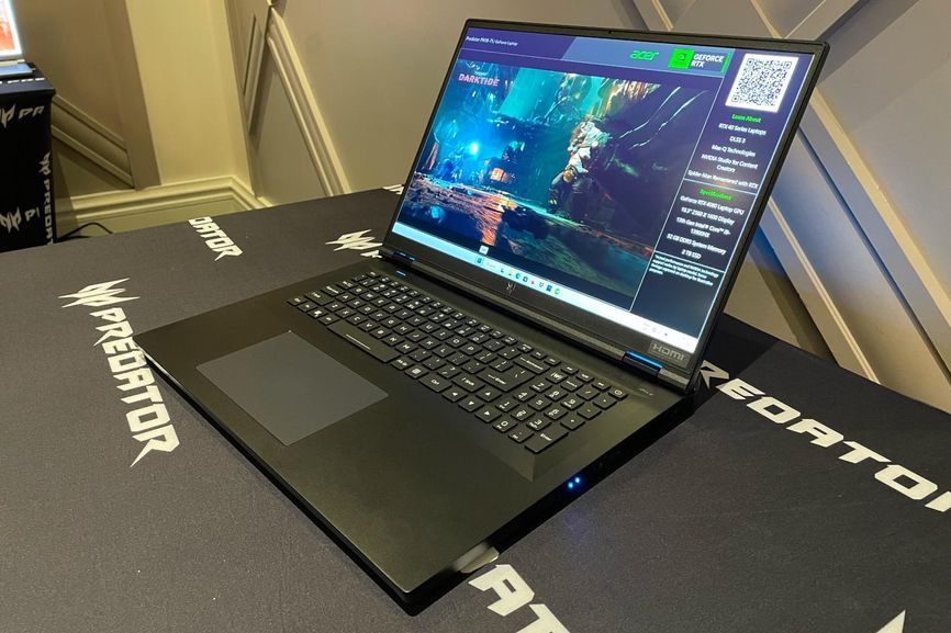 宏碁 Predator Helios 18(18英寸显示屏)是在2023年消费电子展上展出的几款功能强大的大型笔记本电脑之一。图片来源:马修·史密斯(MATTHEW S. SMITH)