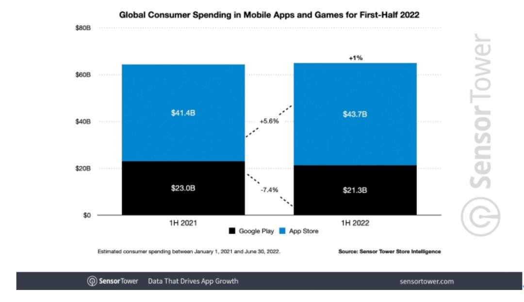 Sensor Tower数据显示,截至2022年上半年,App Store全球消费者支出约437亿美元。以30%的抽成计算,上半年苹果仅靠“苹果税”,就能赚取131.1亿美元左右。