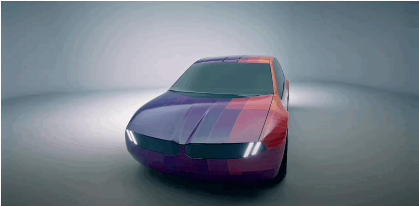 充满运动感的三厢设计下,它使用了 240 个彩色电子墨水面板,每个面板有 32 种颜色选择,从而使车在 32 种车身颜色之间切换(也可以呈现渐变色)。这些面板是激光切割的,并将一种电子纸膜应用于车身和车轮。