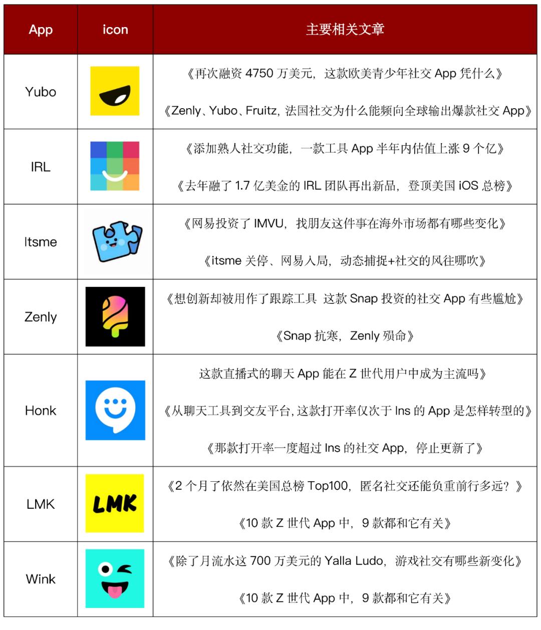 最后总共收录了大约 57 款 App,在 Z 世代社交方向,我们着重分析了当时成绩更为突出的Yubo、IRL、Itsme、Honk、Zenly、Wink、LMK。说来,我们确实是有点“毒奶”本事在身上的。