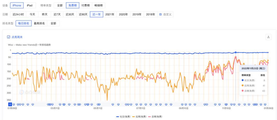 Wizz 正式上线于 2019 年 2 月 14 日,在过去将近 4 年的时间里曾登上英国 App Store 下载总榜 Top1、进入美国、加拿大、澳大利亚等 6 个市场的下载总榜 Top100,以及 75 个国家和地区的社交下载榜 Top100。