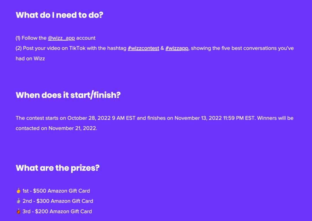 根据活动介绍,在 2022.10.28-11.13 期间,所有 13-25 岁、居住在美国的 Wizz 用户都可以通过关注 Wizz TikTok 官方账户,并在 TikTok 发布带有