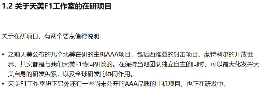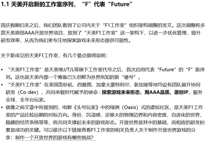 到了10月份,毛星云继续发布第二弹全球招聘令,并宣告了筹划已久、专注于原创AAA开放世界的天美F1工作室正式亮相。毛星云专门介绍了他所在的“天美F1工作室”是天美首次启用代表“Future”的“F”新序列,其使命为∶探索游戏未来形态,用AAA品质、原创IP,服务全球、全平台玩家。而从毛星云描述的意思来看,天美F1工作室旗下可不止一款3A开放世界项目,而是已经将多款不同画风的3A级主机项目纳入了工作室架构下,至于是否都是开放世界品类则不得而知,但毛星云还透露了天美蒙特利尔工作室还未公开的3A级开放世界项目也是与天美F1工作室协同开发的。