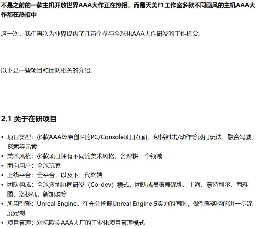 毛星云发布的第二弹全球招聘令提及天美F1工作室有着多款不同画风的3A级原创IP项目