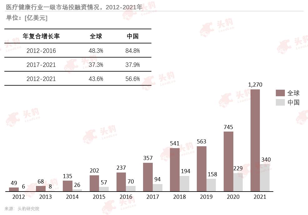 在2012年,中国医药市场投资金额为6亿美元,占全球投资额12.2%。到2021年,中国医疗健康行业投融资金额为340亿美元,同期全球市场为1,270亿美元,占比为26.8%。中国医疗健康市场逐步受资本青睐,资本有望对中国医疗健康行业保持稳步上升的投资。