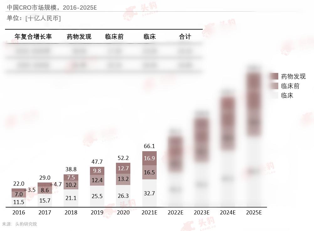 2016-2020年,中国CRO市场从220亿人民币增长到522亿人民币,复合年增长率为24.1%。预测未来CRO市场规模仍保持快速增长趋势,预计于2025年整体市场规模为1,500亿人民币以上。