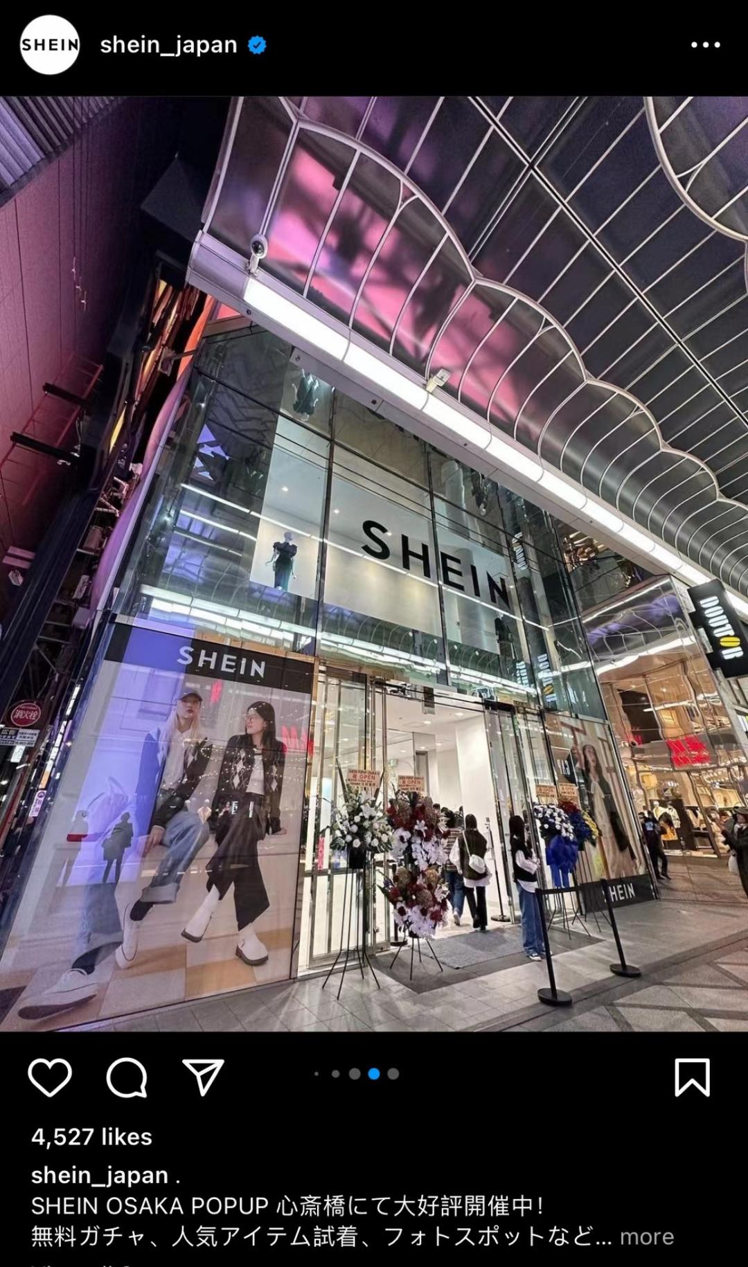 2022年10月22日,SHEIN在日本大阪市最具人气的购物街心斋桥地区,开设了为期3个月的限期线下店“ SHEIN POPUP OSAKA ”,此前这里曾是优衣库的门店。由于疫情的影响,优衣库在长期的暂停营业之后,悄无声息地闭店离开,SHEIN以新一代“快时尚”平台之姿接管了这里。