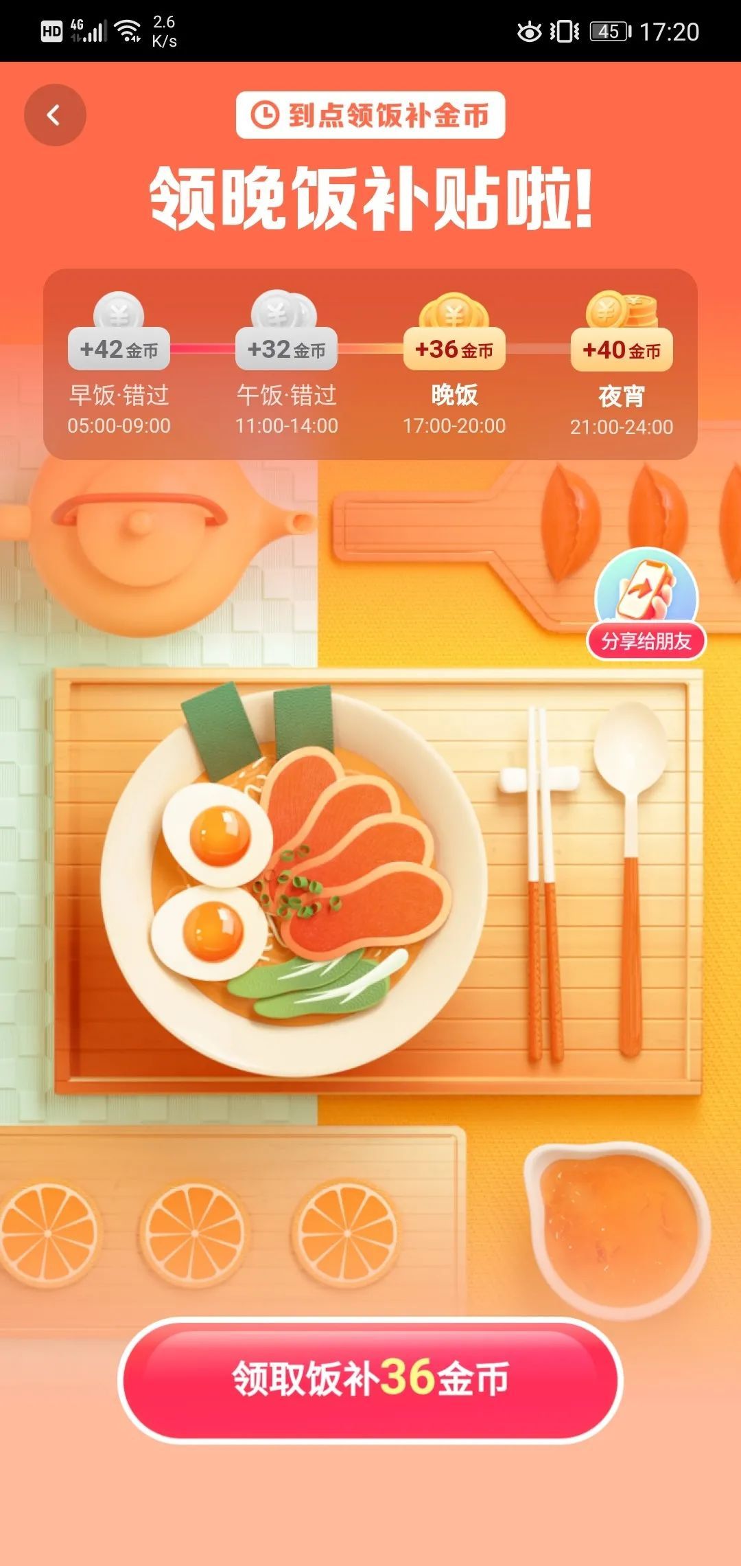 最让人拍案叫绝的是「吃饭补贴」,吃饭补贴分为早饭、午饭、晚饭和夜宵,有固定的领取时间,恰好对应饭点,用户通常在这些时间段有空闲,可以打开 app 领取奖励。不过,吃饭奖励通常不多,换算成人民币常常不到 1 分钱。