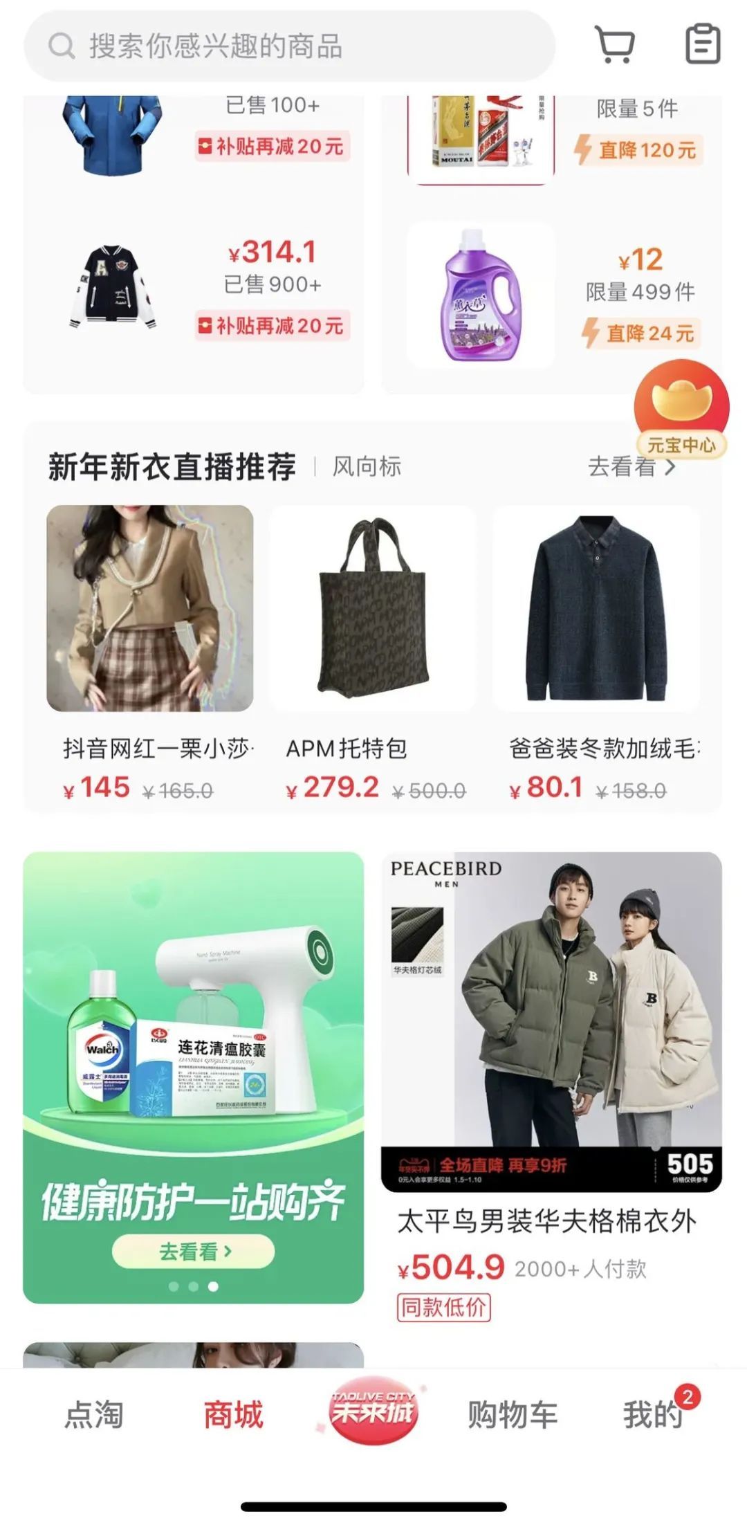 点淘作为淘宝的直播短视频平台,处处能看到电商的影子,很多元宝活动服务于购物,比如观看电商直播或带货视频获得元宝,购物获得元宝,以及用元宝购物等。