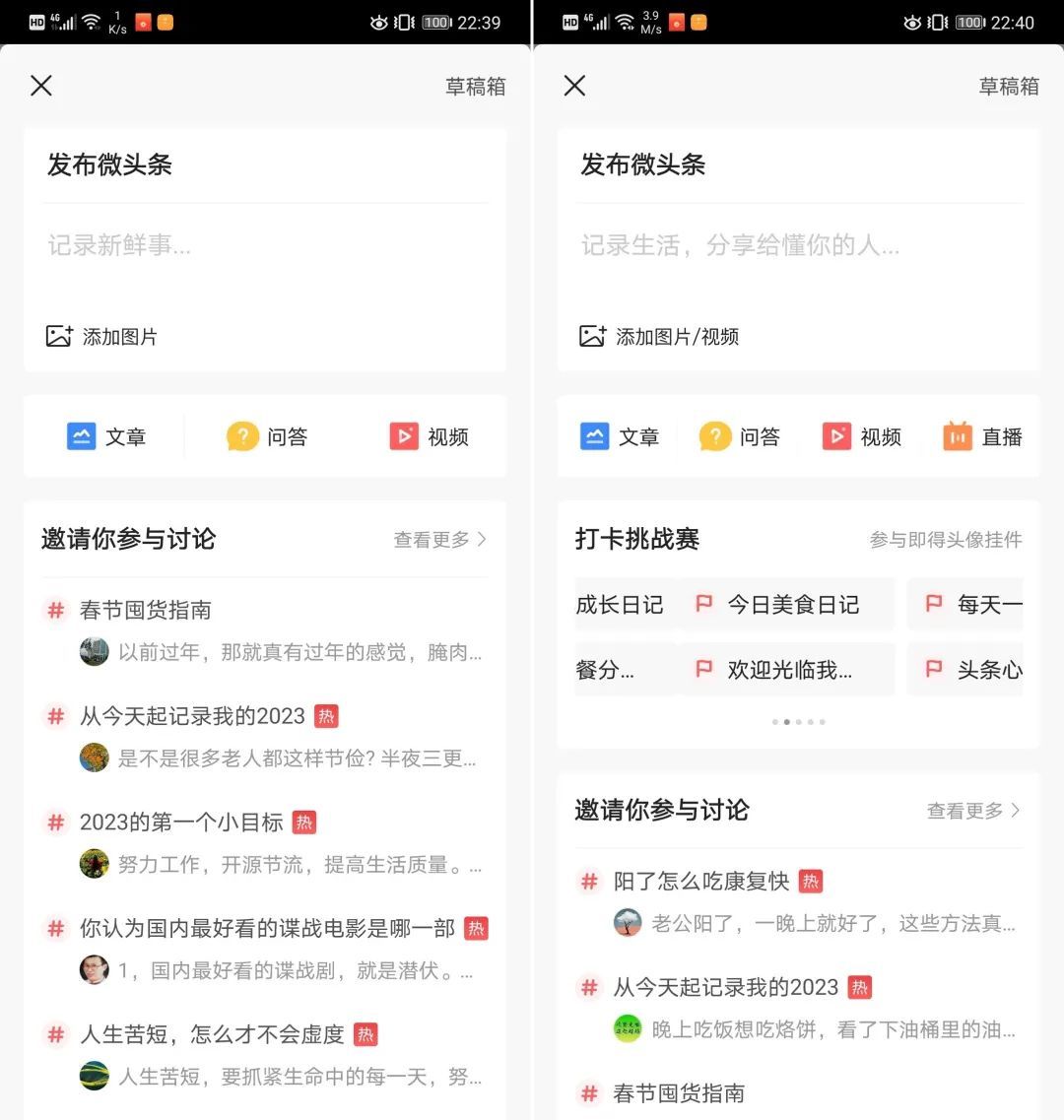 今日头条极速版发布页面(左)和今日头条发布页面(右)