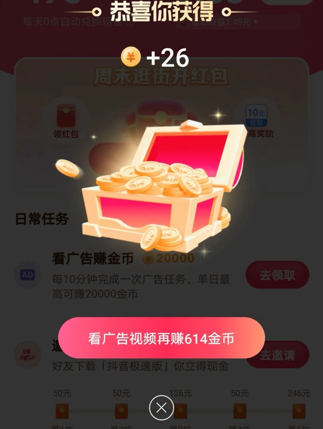 宝箱打开的同时会提示观看视频获得更高额的金币奖励,视频通常是一段 30 秒的广告,「促活」和「转化」就这样悄无声息地在 app 上完成了衔接。