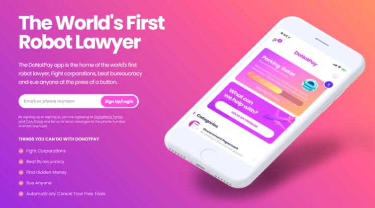 作为一名“机器人律师”,DoNotPay是一款可下载的移动应用程序,利用人工智能提供法律服务,每三个月的订阅费为36美元。目前在英国和美国(全部50个州)都可以买到。