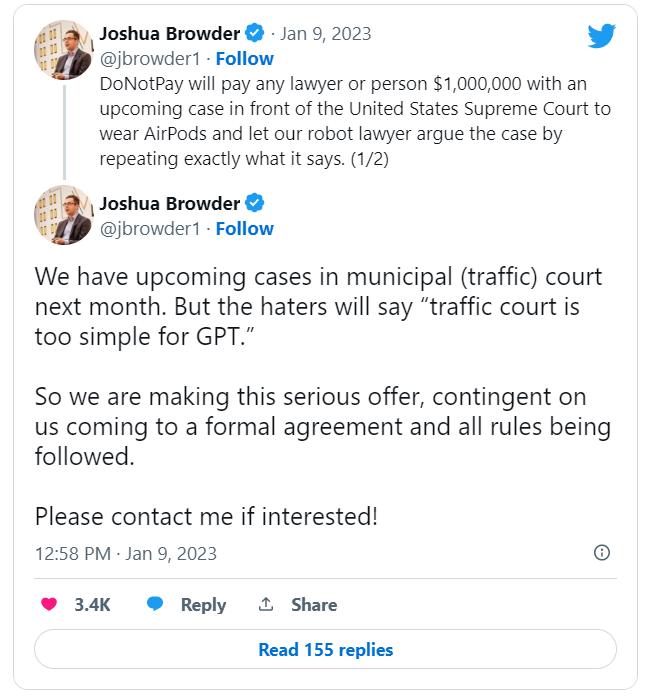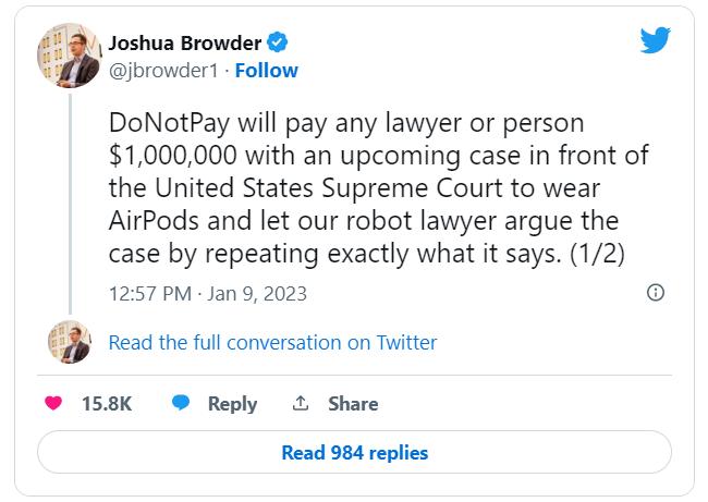 布劳德周日晚间在 Twitter 上写道:“在美国最高法院即将审理的案件中,DoNotPay将向任何律师或个人支付100万美元,让他们佩戴AirPods,并通过重复我们的机器人律师所说的话来辩护。”
