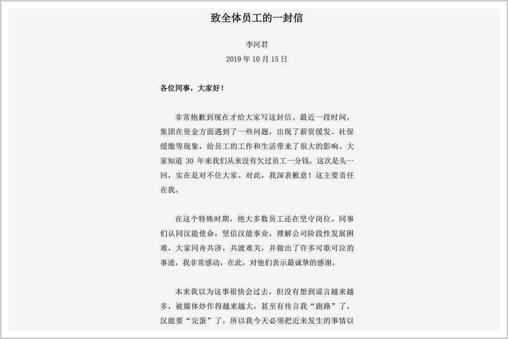 在“李河君出来!”“还我血汗钱!”的喊声中,直到10月15日,李河君终于站了出来,发布了致全体员工的一封信首次回应汉能集团欠薪事件。