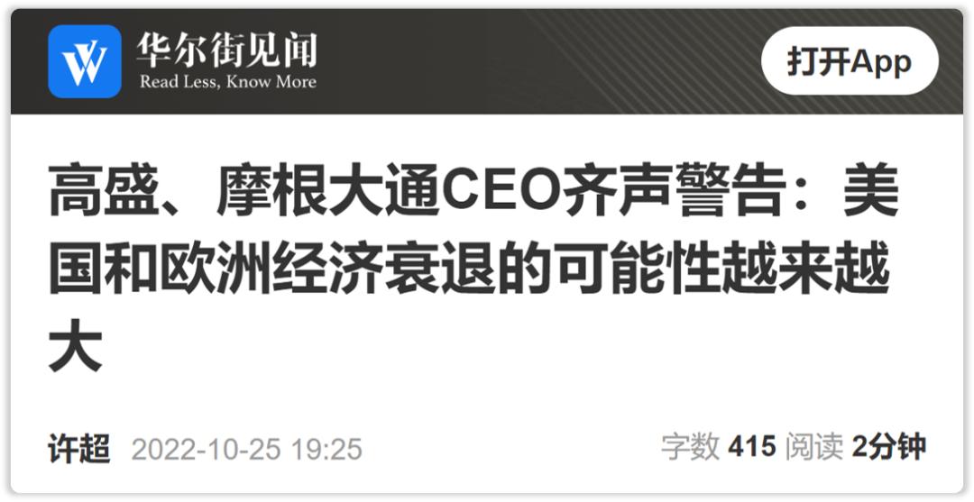 《高盛、摩根大通CEO齐声警告:美国和欧洲经济衰退的可能性越来越大》